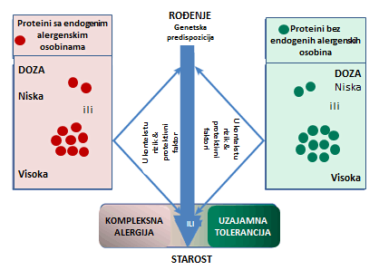 Sensitization is a complex interaction between the exposed person (inherited risk of becoming allergic) and the time of exposure (at the earliest age of life the immune system is more susceptible to sensitization, but also to the induction of tolerance), the dose of the allergen (high exposure at an early age can lead to a deviation in the direction of tolerance ), exposure context (environmental exposure such as pollution, microbes, parasites, diet, lifestyle) and endogenous protein properties.